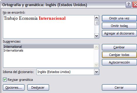 Lo primero que deberás de cuidar para tener una adecuada revisión es asegurarte que el idioma del diccionario es el requerido. Por ejemplo en la imágen posterior vemos que Idioma del diccionario es Inglés (Estados Unidos), por ello no reconoce la palabra international, lo cual no debería de mostrar.