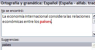 Por ejemplo en la imágen siguiente vemos que la revisión ha identificado la palabra "paises" (marcada en rojo) como no encontrada en el diccionario. Esta es la indicación de que puede haber un error .